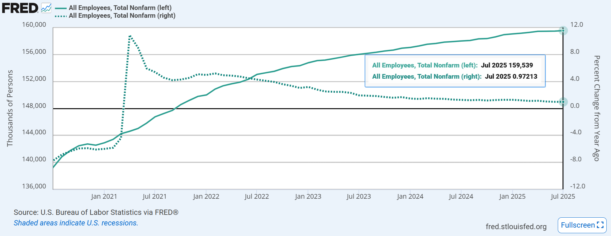 移民の退出のおかげで失業率上昇と賃金デフレはどうやら遠いようだが、これは要するに縮小均衡である。NFP雇用総数を見るとそれまで急速に伸びていたのが2025年にほとんど横ばいになった。前年比で言うと1%以下の伸びになっている。マージナルな需給バランスは賃金と物価の方に影響を及ぼすとして、そもそもの経済成長を考える時、むしろNFPの方が米国経済の規模感をより表しているのではないだろうか。