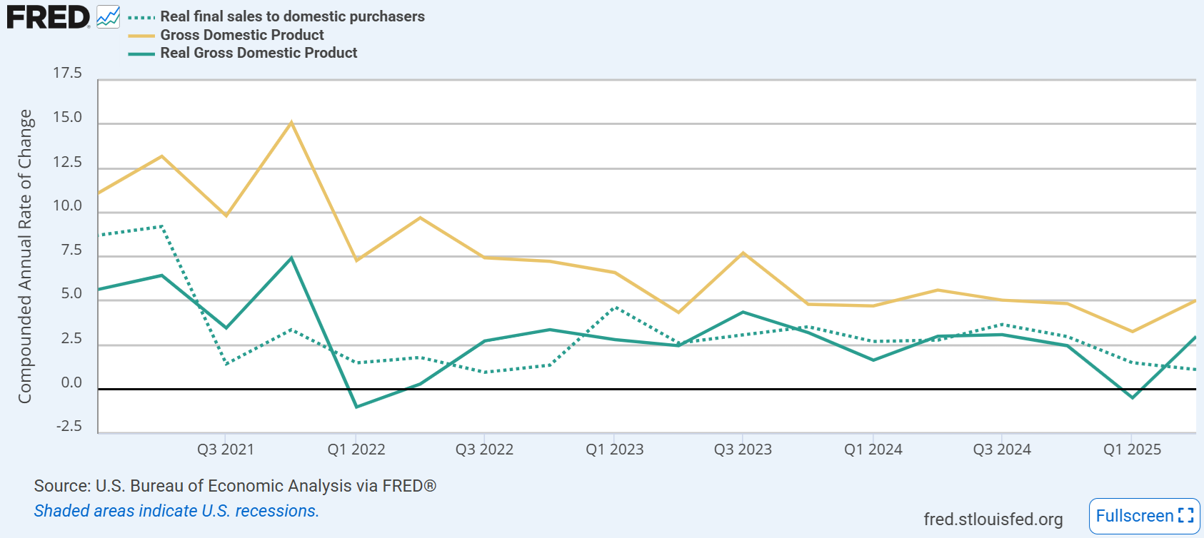 もちろんこれは差し迫った懸念であると主張するわけではない。ADPを見ても最新の民間雇用は少し盛り返している。過去の景気後退は実質小売売上高が横ばいを経て低下に転落することで起きている。2025年現在では小売売上高の伸びはほぼ全てが物価上昇分であり、つまり消費者は総じて消費個数を減らさずに物価上昇に付いてきたことを意味するが、実質ベースでは横ばいが続く。仮に移民減に伴いこちらが下向きになった場合、たとえ失業率が横ばいでもサームルールが一気に近付いてくる。もっともこの手の減速は利下げで十分食い止められるものであり、家計部門の負債が重いわけでもない中で本格的な景気後退には至らないだろう。