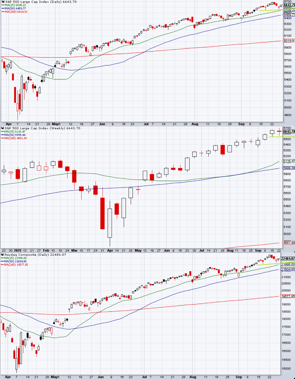 S&P 500は少しだけ高値波乱となり、FOMCがもたらした金融相場バブルを巻き戻す動きが優勢になった。月曜9/22だけは力強い上値追いとなったが、マイクロン決算前日には警戒が入り、それを無事通過しても反発とはならなかった。木曜9/25はかなりしつこい下値攻めとなり、週足サポートの6550を二度もトライしたが二度跳ね返され、金曜9/26にようやく反発している。先週の記事では6550を週足サポートとしつつ「10/1に政府閉鎖となる懸念が急に持ち上がっており、また9月末は短期市場の資金逼迫イベントが控えているためニュースには事欠かない予定であり、限定的な規模の振り落としには意外さを感じないようにしたい」としていたが、まさに限定的な規模の振り落としが行われた。