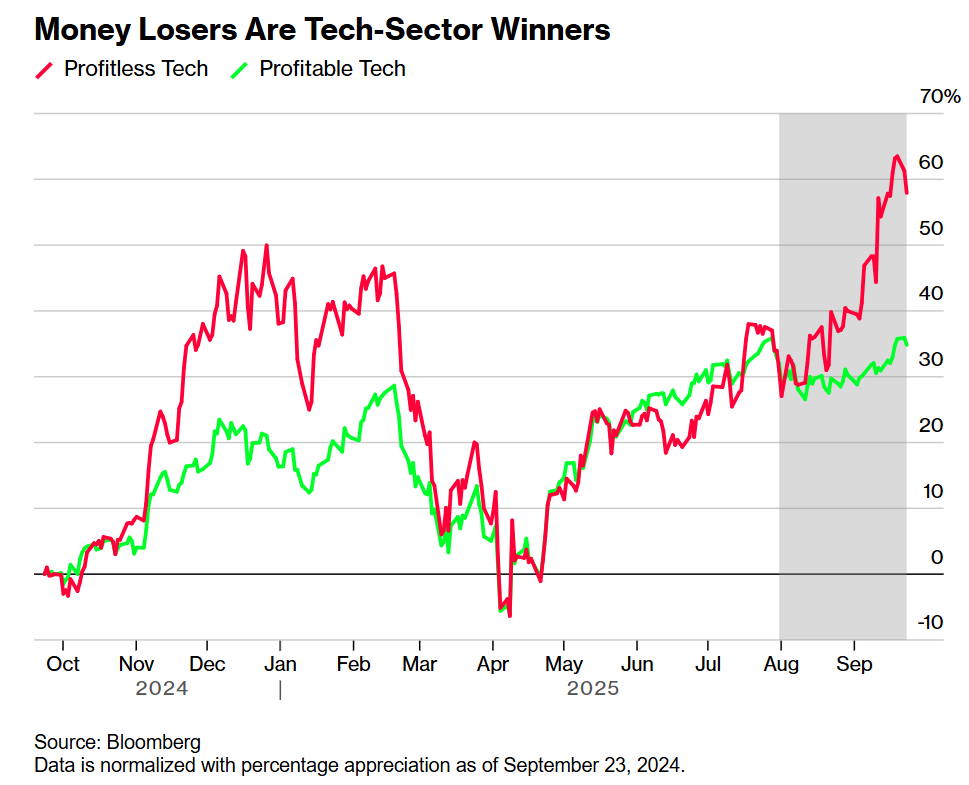 利下げ期待の高まりと共に赤字テックがアウトパフォームしたのも金融相場バブルの証である。