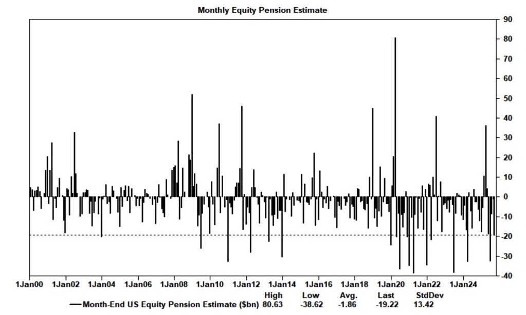 今月・今四半期は株式指数が大幅に上昇したこともあって、四半期末引けに向けて年金のリバランスの株式売りが出やすいとGSは指摘する。