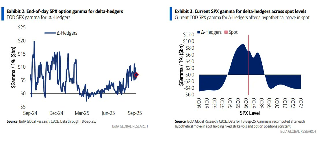 BofAのディーラーガンマはポジティブガンマの山が徐々に左右に広がって来た。これは引続き多少の下落圧力に対してはまずポジティブガンマホルダーの買戻しが最初のバッファになることを示唆する。本格的に荒れて来るのは6400を割って来た時だろう。9/30にエクスパイアを迎えるJPMカラー(JHEQX)のコール売りが6505に刺さっている(本ブログは7月に6480 / 5850 / 4940とメモっていたがこれまでと同様少し間違えている)。もし週前半の2営業日で6500台を下落するようなら6505に吸い寄せられやすそうにも見えるが、少し遠いため基本的にはあまり影響力を発揮しなさそうである。