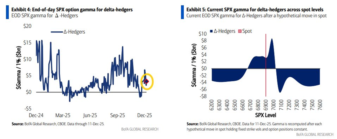ディーラーガンマは6900台のコールウォールが急速に成長している。元々スポットを挟み込むように左右二つの山が出来ていたのが、右の山が完全に左の山より高くなってしまっている。これはレジスタンスがサポートより強いことを意味し、年末までとても右のコールウォールを超えられなそうということで余ったコールの投げが激しかったようである。その結果、VIXが上がらないまま指数だけが淡々と売り込まれた。逆に下値は左の高原の左端に極めて近い6720までトライした。もっとも週末にかけてスポットが反発したことで、ネガティブガンマ転落は間一髪で回避された。