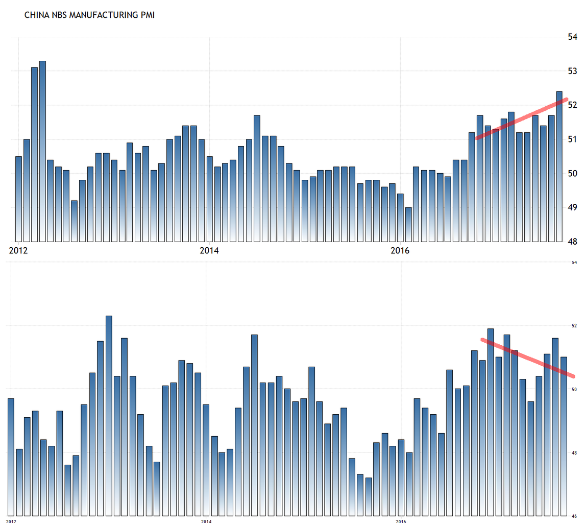 背景としては、2017年の金融引き締めとサプライサイド改革(生産力削減)は、中小企業の体力を集中的に奪ったように見える。上のチャートが大企業が多い公式製造業PMI、下が中小企業も多いCAIXIN製造業PMIだが、2017年に入って明らかに格差が拡大している。