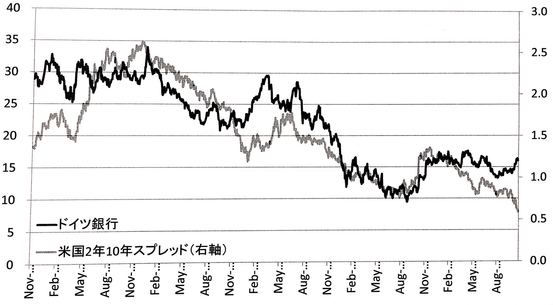 海の向こうの米国の2-10スプレッドでドイツ銀行株の株価変動の実に69%が説明されている。従来通りの相関が保たれるとすればフラットニングが進むにつれてドイツ銀行株が更に下落する可能性が高いが、幹部たちにとって喜ばしいことに、切片が6ユーロなので、2-10スプレッドがフラットになってもドイツ銀行株は6ユーロ残る計算になる。その後金融危機がやってきたらわからない。