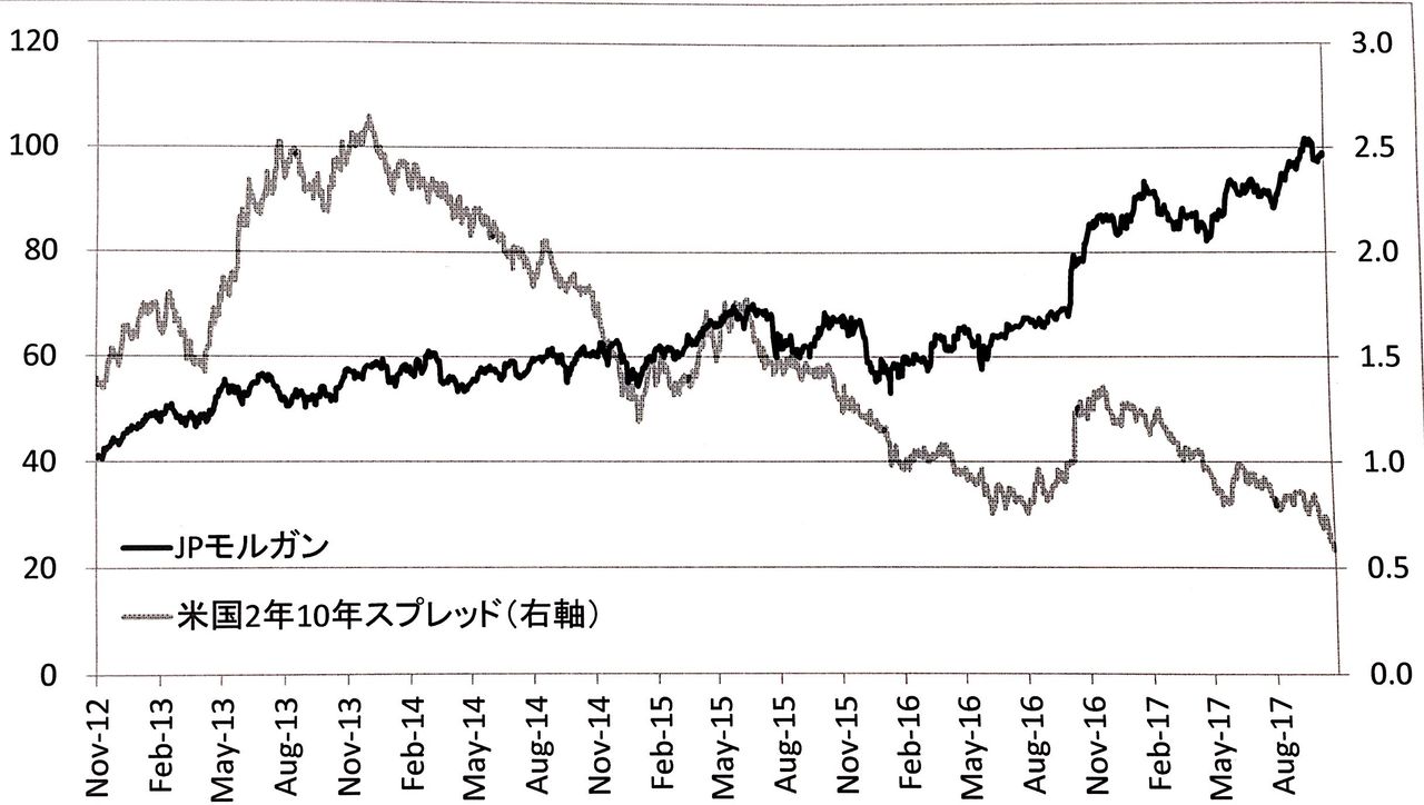 米金利の大フラットニングが話題になっているなか、銀行は短期で調達して長期で運用しているため、フラットニングで銀行の収益が圧迫されて銀行株が下がるのではないかという懸念が根強い。銀行株と金利の関係性の話題はトランプ相場で米金利が急上昇する中で米銀株が大きく上昇したのが始まりであり、いまはそれを鏡に映した形である(さらに日銀のマイナス金利導入で銀行株が暴落したところまでさかのぼっても良い)。